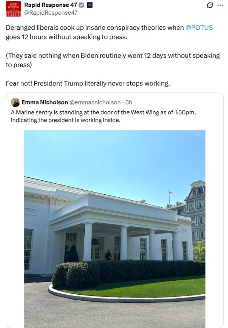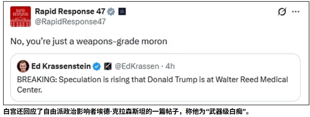 此外,白宫官方账号“快速反应47(Rapid Response 47)”账号也在X平台上连续发文,严厉否认相关传闻,称所谓特朗普被紧急送医的说法完全是谣言。