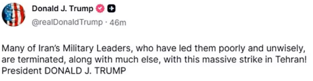 与此同时,特朗普本人也在其社交平台Truth Social发布有关伊朗局势的更新,附带一段伊朗夜空爆炸画面的视频,并写道:“许多错误领导伊朗军队的军事领导人已经被终结……”