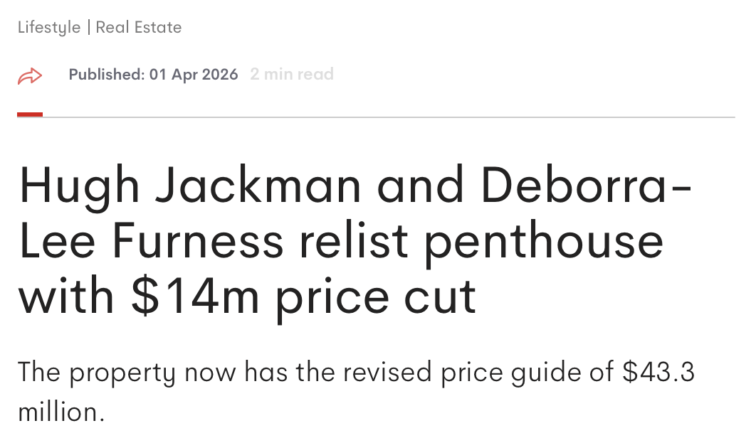 澳洲籍好莱坞明星 “金刚狼” Hugh Jackman的一套豪宅正在 “打骨折”,他与前妻Deborra-Lee Furness名下的一套纽约顶层公寓刚刚再度挂牌出售,而且价格大幅下调达千万美元!