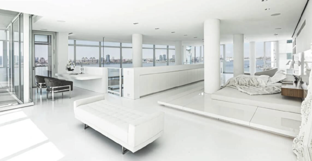 这套顶层公寓横跨整栋建筑的三个楼层,由知名建筑师 Richard Meier 设计,被房源描述为 “现代主义杰作” ,可俯瞰哈德逊河景观。