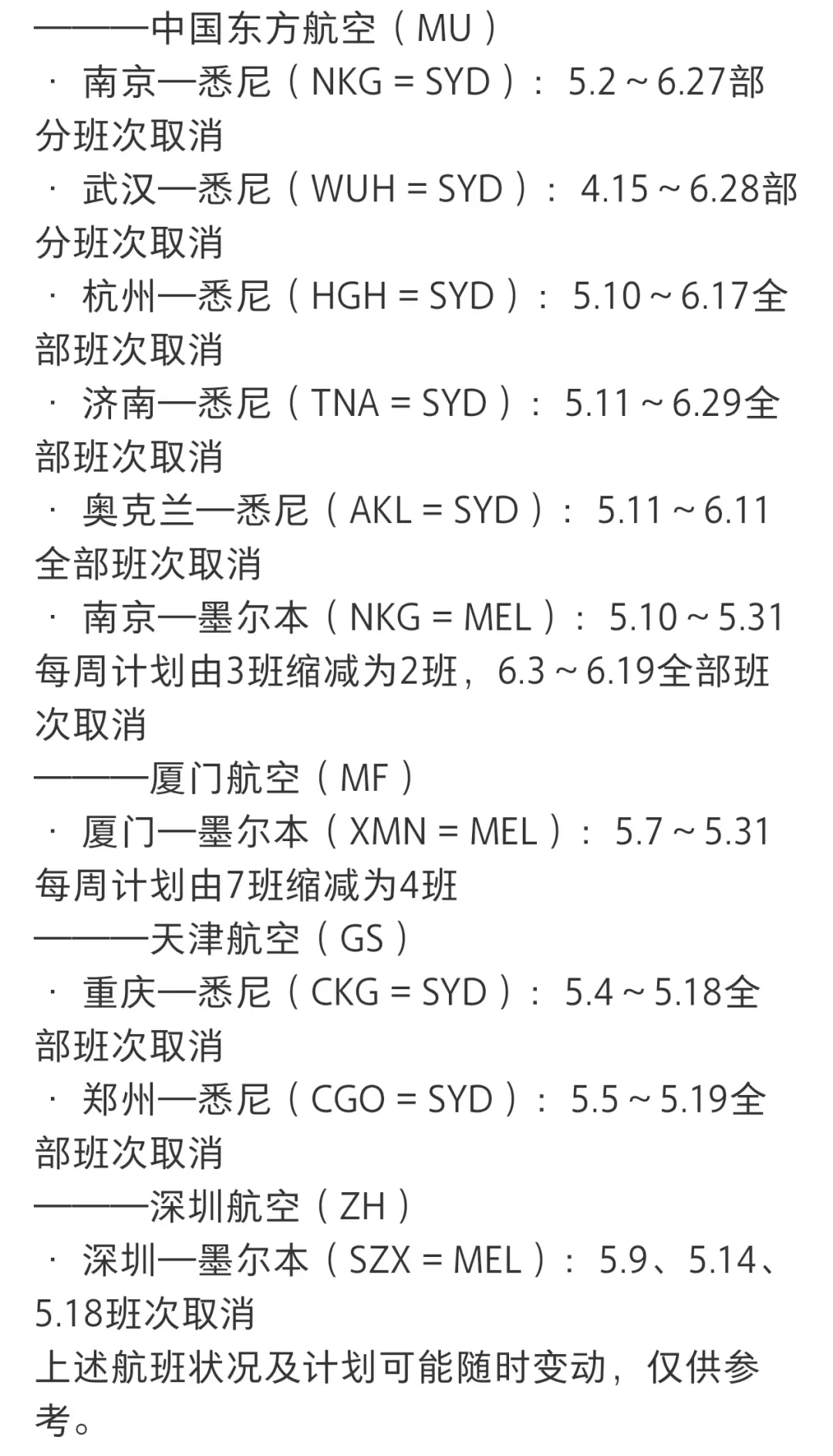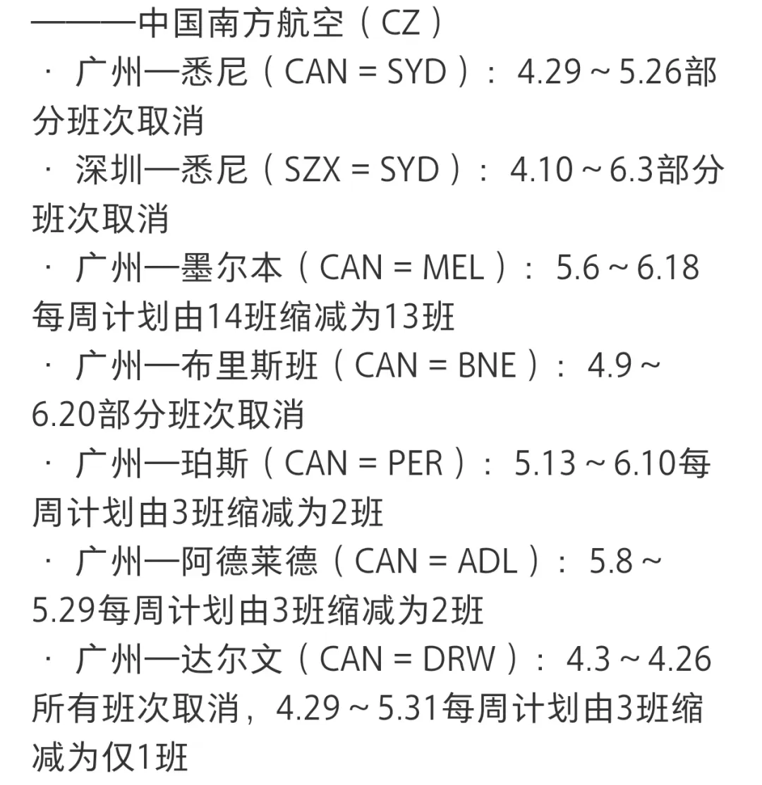 根据社交平台用户整理,涉及广州、杭州、南京、厦门、重庆等多个国内城市与澳洲之间的航线,均出现不同程度的班次削减,有的是减少频次,有的则直接取消原有航班计划。