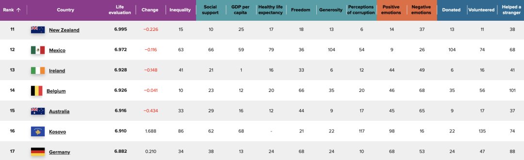 而今年其他中南美洲国家中,墨西哥排名第12,也显示出该地区整体生活满意度的稳步提升。