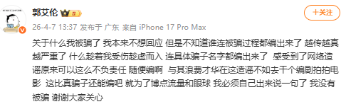 收藏郭艾伦发文否认被骗近千万元:我没有被骗,谢谢大家关心,网络造谣原来可以这么不负责任,随便编啊