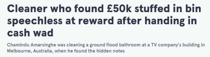 他的这种优秀品质也得到了回报,因为长时间无人认领,他最终获得了8万澳元奖金。