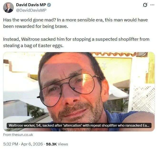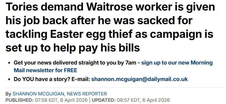 可是,Waitrose超市却因为他制止了一名扒手偷走一袋复活节彩蛋而解雇了他。”