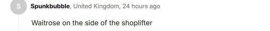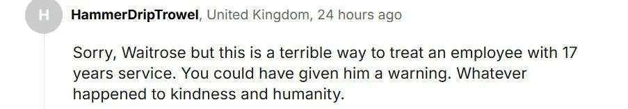 “很遗憾,Waitrose超市,但这样对待一名有17年工龄的员工实在太差劲了。你们本可以先给他一个警告。那些曾经的善意与人情味都去哪儿了?”