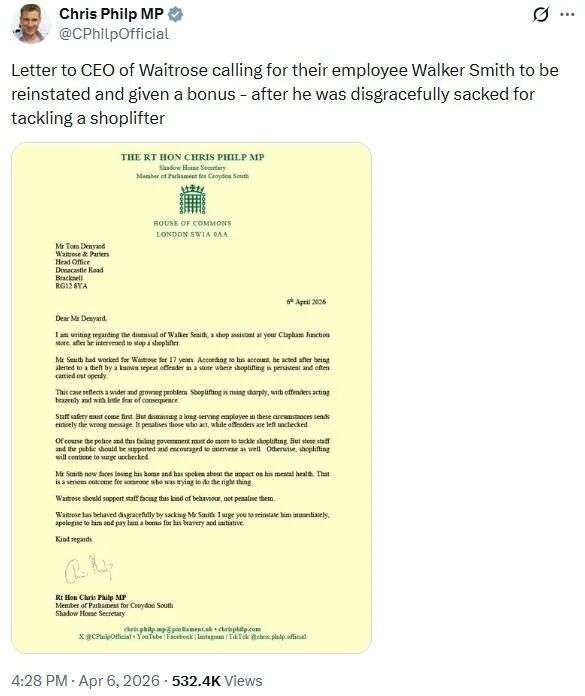 影子内政大臣克里斯·菲尔普(Chris Philp)表示,Waitrose超市解雇史密斯的做法“令人不齿”,他已经致信该超市的总经理,要求给史密斯复职,并给他发奖金,以表彰他的勇气和主动性。