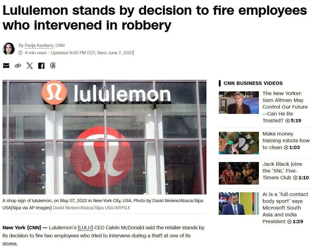 因为Lululemon那件事后,Lululemon的CEO仍然坚定地表示,解雇见义勇为员工的做法没错。