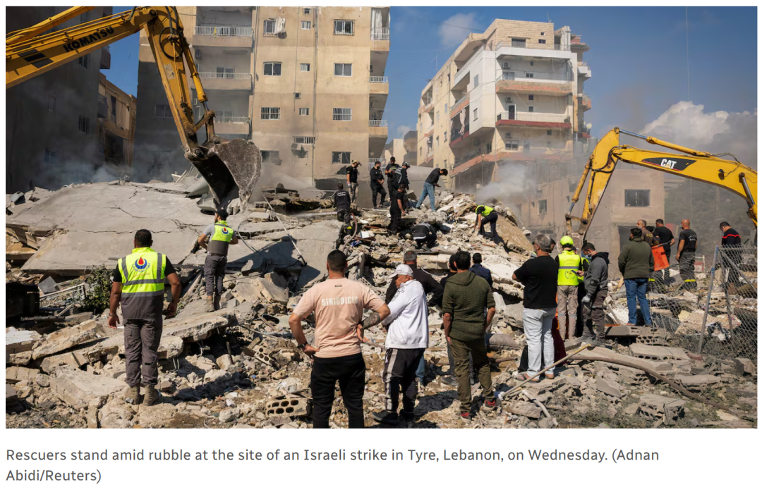 黎巴嫩社会事务部长赛义德说,这些打击是“极其危险的转折点”——贝鲁特现在收容了一半的国内流离失所者,而炸弹就落在他们头上。她说黎巴嫩政府愿意直接与以色列谈判停火,但以色列根本不接茬。