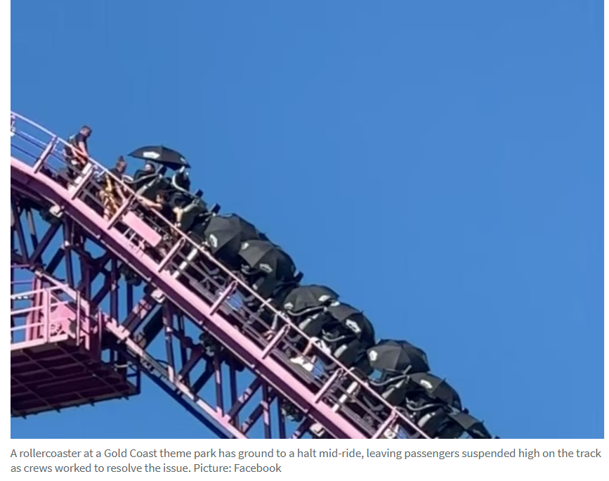 据报道,黄金海岸一家主题公园的过山车在运行途中突然停止,导致乘客悬停在空中。