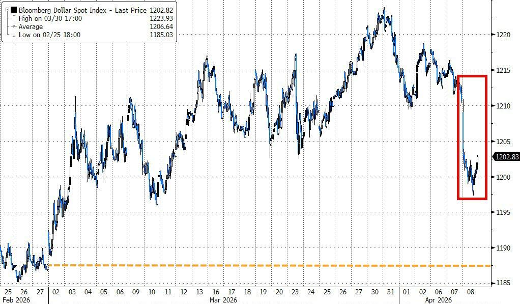 Monex Inc.外汇交易员Andrew Hazlett表示:停火消息及能源危机担忧缓解,令美元承受显著压力。未来数日的核心问题将是:霍尔木兹的航运恢复程度如何,这是否能带来持续的局势降级?