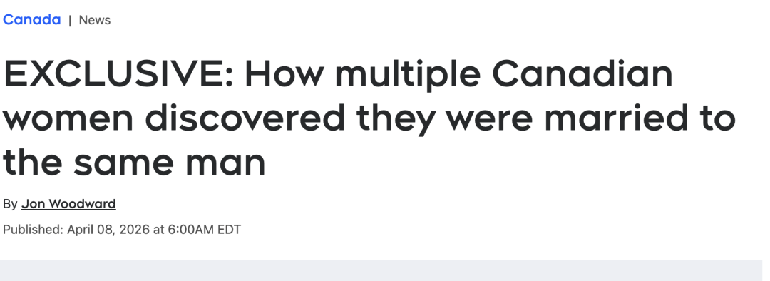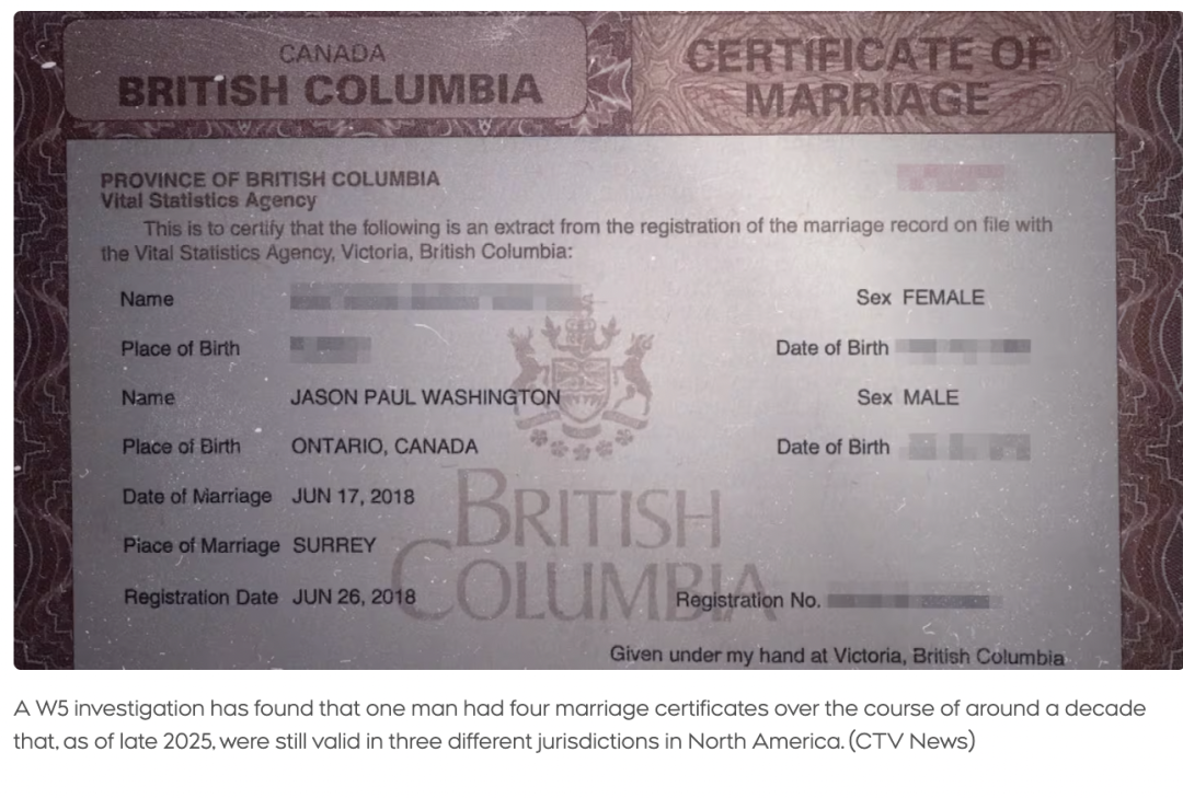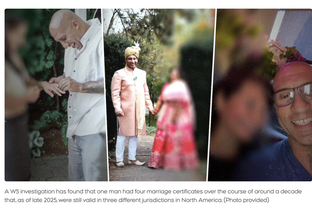 但CTV新闻调查发现,这名男子在大约十年时间里,竟然拥有 4份结婚证,而且截至 2025年年底,其中 3个北美不同司法辖区里的婚姻关系竟然仍然同时有效。