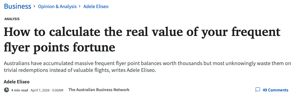 一张价值3000澳元的商务舱机票,如果用10万积分兑换,相当于每点价值3澳分。