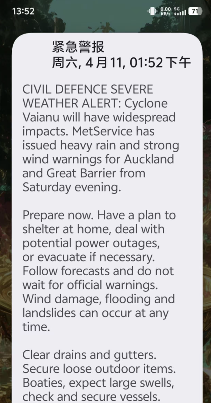 奥克兰全境的手机均已收到紧急警报,提醒居民立即为气旋Vaianu的影响做好准备。