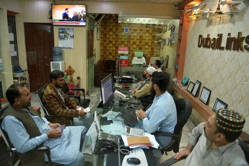 4月11日,巴基斯坦白沙瓦市,民众通过电视观看美国代表抵达伊斯兰堡参加美伊和谈。 IC Photo