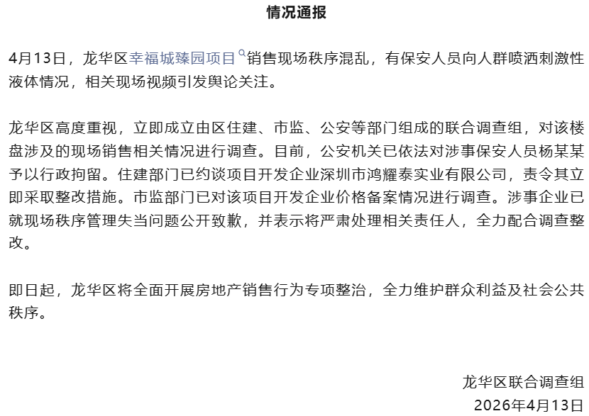 龙华区高度重视,立即成立由区住建、市监、公安等部门组成的联合调查组,对该楼盘涉及的现场销售相关情况进行调查。目前,公安机关已依法对涉事保安人员杨某某予以行政拘留。住建部门已约谈项目开发企业深圳市鸿耀泰实业有限公司,责令其立即采取整改措施。市监部门已对该项目开发企业价格备案情况进行调查。涉事企业已就现场秩序管理失当问题公开致歉,并表示将严肃处理相关责任人,全力配合调查整改。