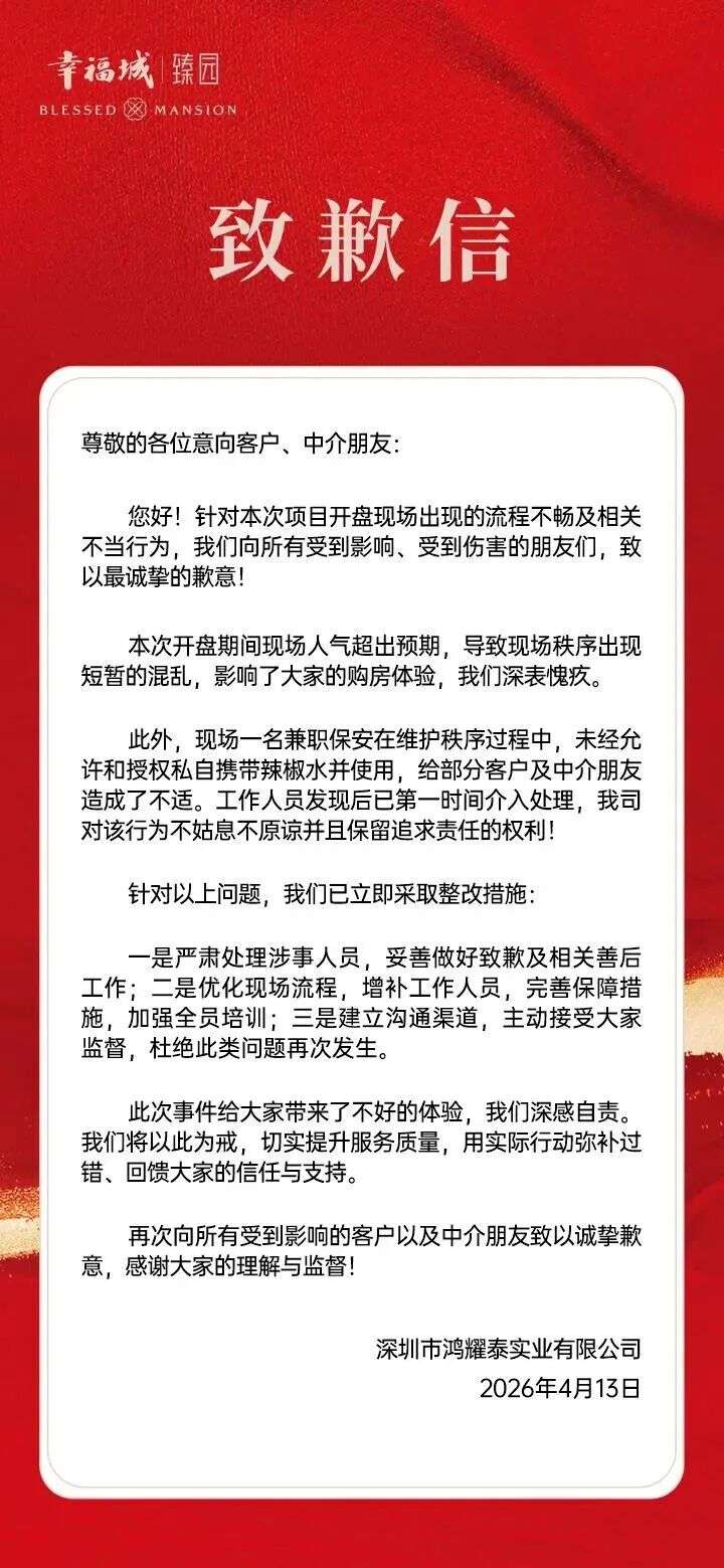 当天中午,开发商深圳市鸿耀泰实业有限公司在其微信公众号“幸福城丨臻园”发布致歉信。