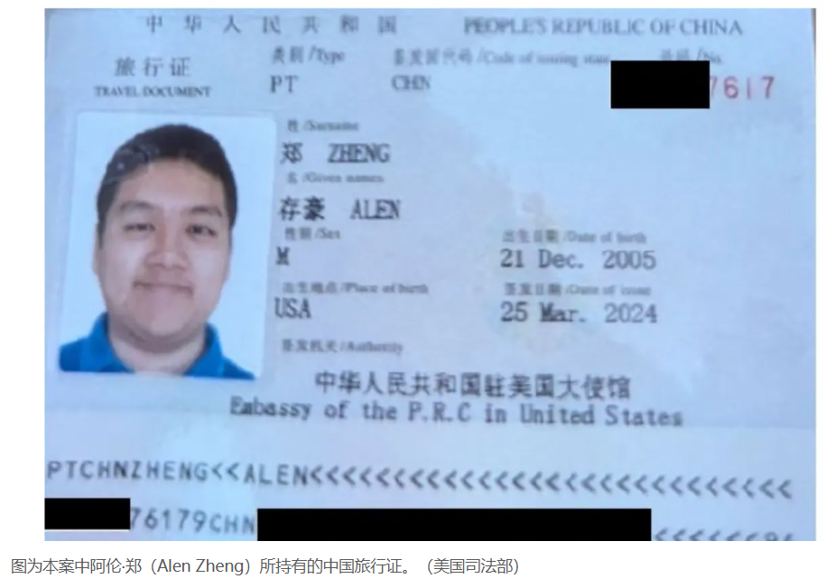 司法部在4月3日提交的法庭文件中表示,探员们发现郑某填写了一份《境外人员住宿登记表》表格,显示他获准在中国停留至2028年。而他之前已经拥有由中国驻美大使馆于2024年3月25日签发的旅行证。