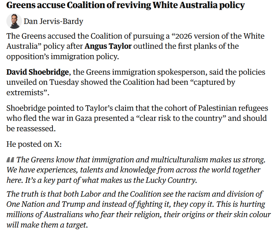 在他概述了反对党的移民政策要点后,澳洲绿党指责联盟党正在推行“2026年版的白澳政策”,以及连同工党一起骂。