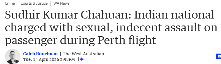 54岁的Sudhir Kumar Chahuan周二在珀斯地方法院(Perth Magistrates Court)出庭,被控“未经同意发生性行为”以及三项猥亵侵犯罪。相关指控源于周一凌晨乘客向机组人员报告的一起严重事件。