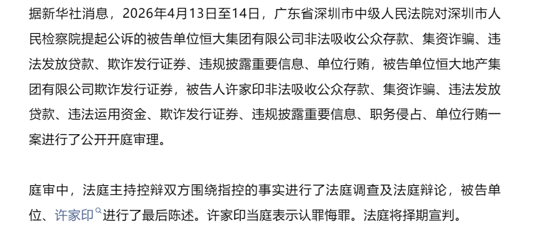 由于恒大案涉及金额极其巨大(债务达 2.44 万亿元)、受害者众多且案情复杂,法庭宣布将择期宣判。