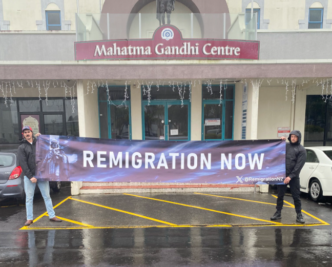 据悉,这两人来自一个自称“新西兰再移民”(Remigration New Zealand)的组织,当天在Eden Terrace的Mahatma Gandhi Centre外聚集。