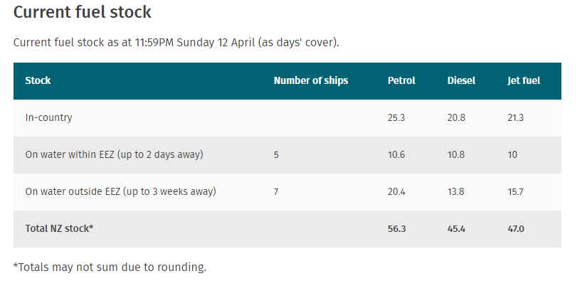 若将“在途燃料”(即未来三周内运抵新西兰的海运燃料)计算在内,则汽油总储量为56.3天用量,柴油为45.4天,航空燃油为47天。