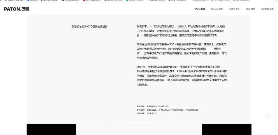 据公开信息显示,设计公司系杭州巴顿品牌设计有限公司,该公司官网展示了张雪机车ZXMOTO品牌全案设计案例,包括LOGO、店面、服装、员工工牌等,设计理念是商标以张雪首字母ZX为核心,用利落几何线条重构,以凌厉斜切造型传递赛道速度感,彰显机车运动的激情与专业。