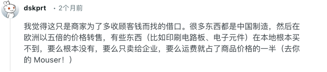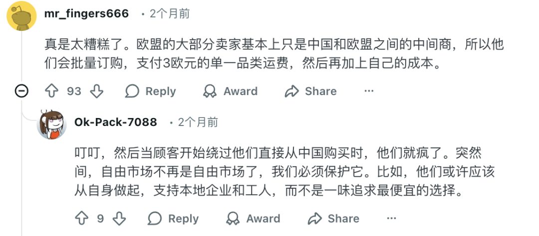 还有网友提到,“欧盟大部分商家只是中国和欧盟之间的中间商,当顾客绕过中间商直接从中国购买时,他们就疯了”。