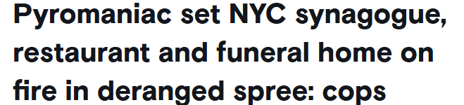 这起案件并非孤立事件。就在两天前,一名曾有15次被捕记录的纵火犯,因涉嫌向布鲁克林一家商店投掷燃烧瓶被逮捕,大火导致一名消防员受伤。