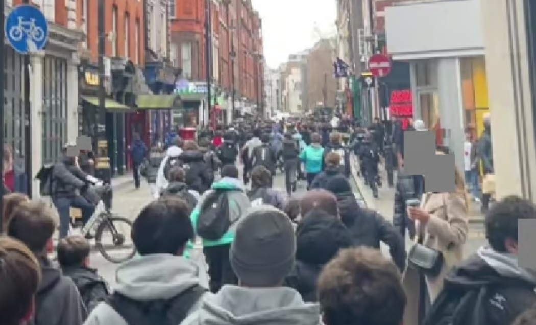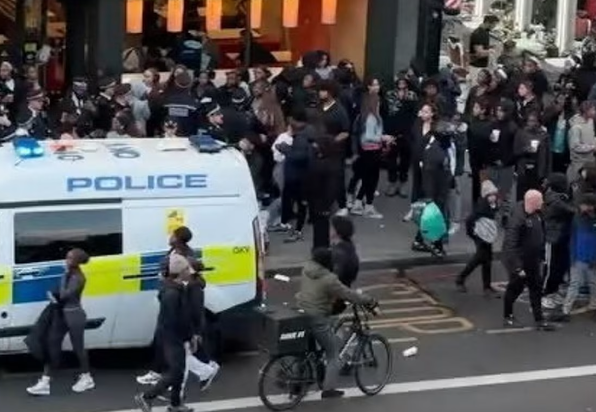 场面一度非常离谱。有视频显示,几十个青少年攀爬长椅和雕像,公然跟警察对着干。有的甚至向警察扔披萨盒。还有孩子沿着牛津街一路狂奔赶往现场,警察试图拉开两个躺在地上骑着Lime单车的男孩,场面乱成一锅粥。