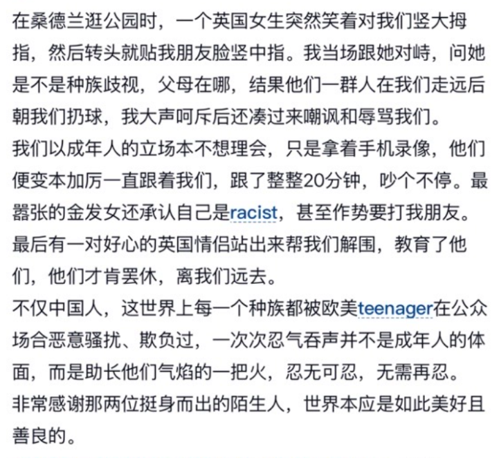 当事人说得很扎心:“不仅中国人,这世界上每一个种族都被欧美teenager在公众场合恶意骚扰、欺负过。一次次忍气吞声并不是成年人的体面,而是助长他们气焰的一把火。”