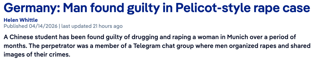 4月14日,德国慕尼黑地方法院当庭宣判,这名名为钟义(音译,法庭判决名为Zhongyi J.)的中国留学生,因两项谋杀未遂、7项加重强奸罪,被判处有期徒刑11年零3个月。