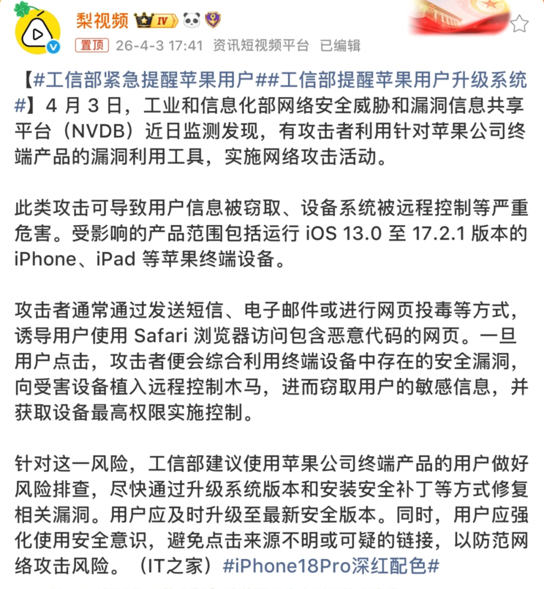 早在4月3日,工信部就已发布预警,指出有黑客利用系统漏洞攻击苹果设备,受影响范围涵盖运行iOS13.0至17.2.1版本的iPhone、iPad等产品。如今苹果官方跟进发布安全公告,明确建议用户升级至iOS 26最新版本。