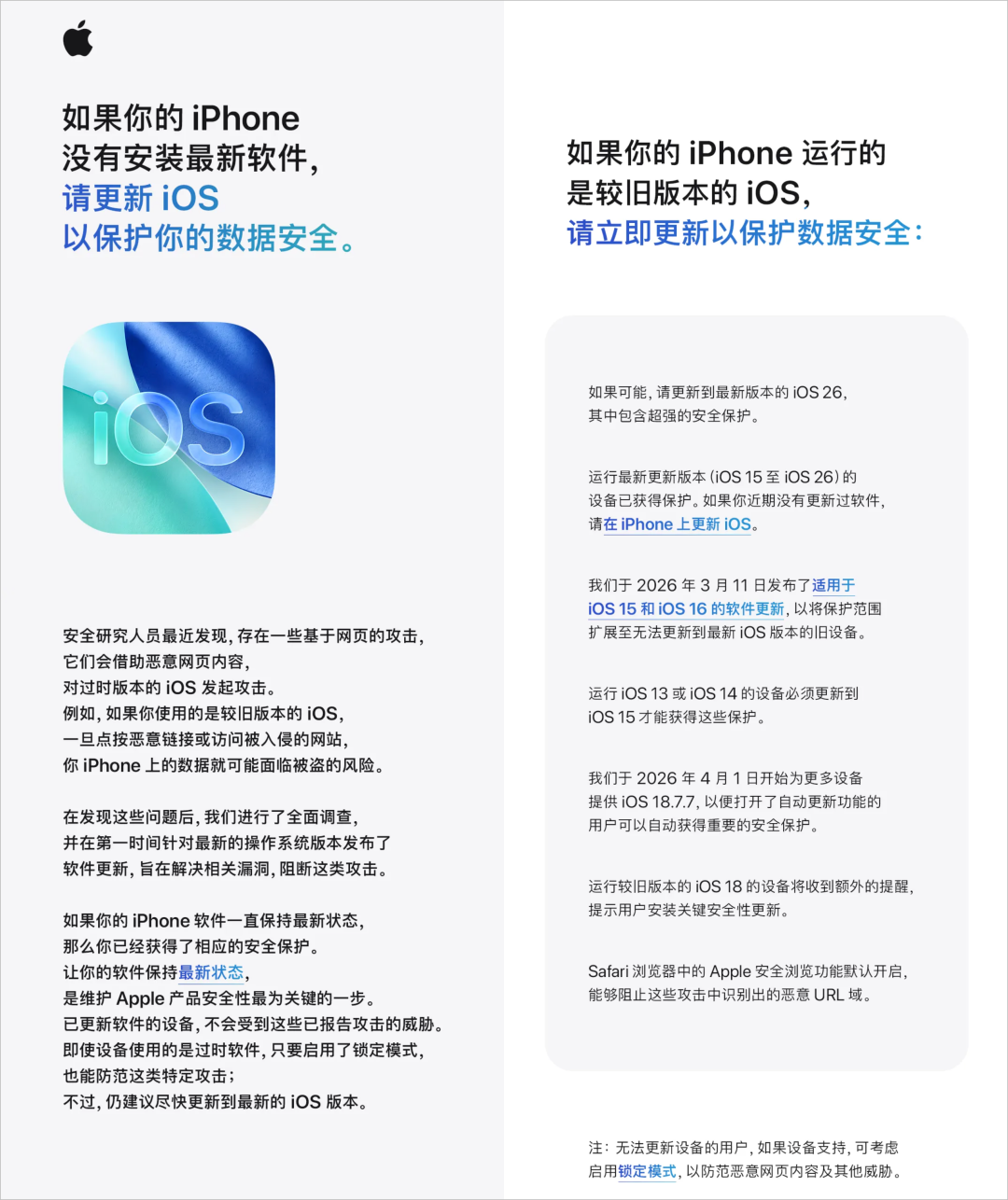 不同于以往默默推送更新或简单附说明的模式,此次苹果直接下场催更,足以说明当前存在的系统漏洞绝非小事。