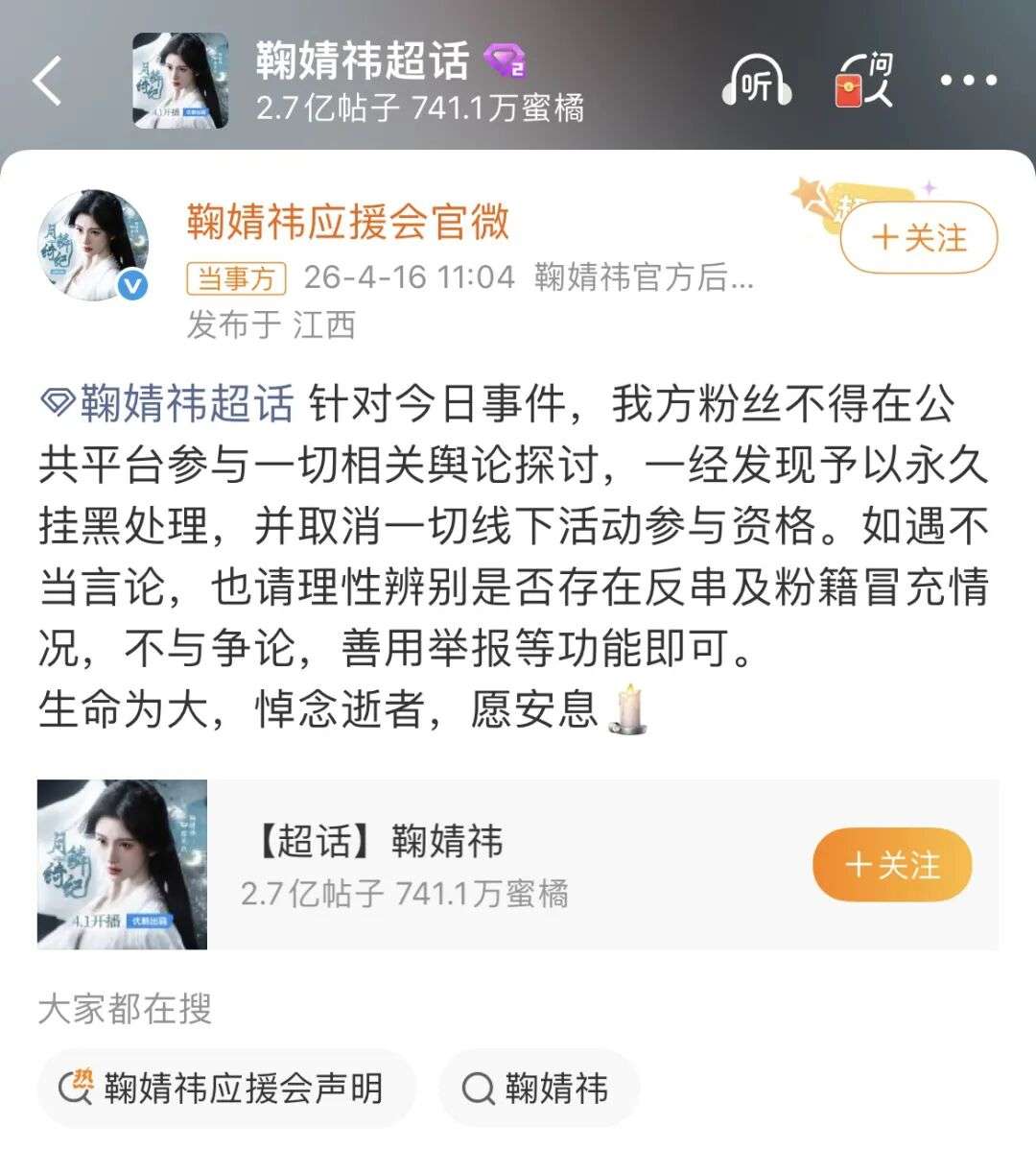 公告上白纸黑字,写得明明白白:不许在任何公共平台参与相关舆论探讨!发现一个直接永久挂黑处理,连线下活动资格都给你取消掉。虽然语气很官方,但说白了就是在告诉粉丝:咱们的底线是做人,不要拿人命开玩笑。谁敢去蹭这个热度、带这个节奏,直接踢出粉籍,不送。