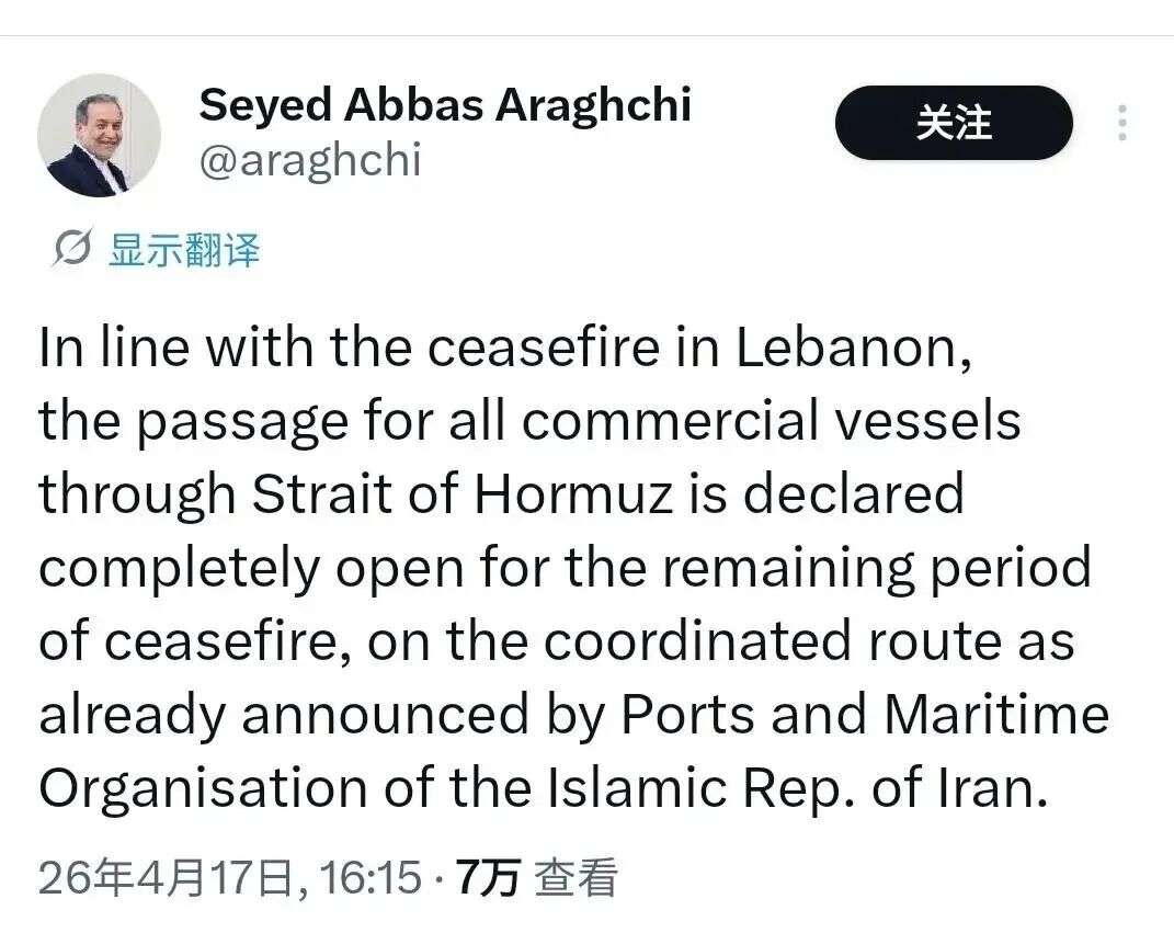 伊朗外长阿拉格齐在社交平台上官宣重磅消息。他说黎以已经停火了,在停火剩下的日子里,霍尔木兹海峡对所有商船“完全开放”。