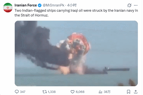 另有报道显示,至少两艘印度船只在枪战后被迫驶出海峡,其中一艘为悬挂印度国旗的超大型油轮(VLCC),载有约200万桶伊拉克石油。印度外交部随后召见伊朗大使,表达“深切关注”,并敦促德黑兰立即确保其船只在该水道的安全通行。