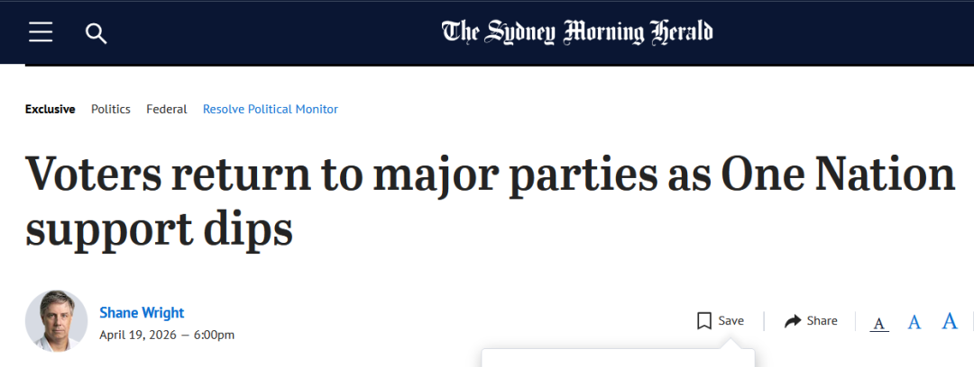 《澳洲人报》的最新一期Newspoll数据也是显示一国党支持率下滑(从27%降低至24%)。