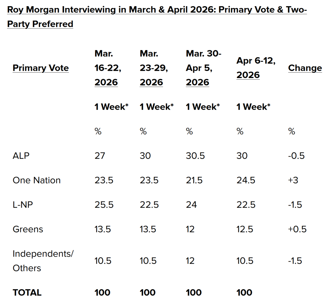 之前Roy Morgan发布最新一期(4月6日至12日)民调数据,工党首选支持率则基本保持在30%不变。