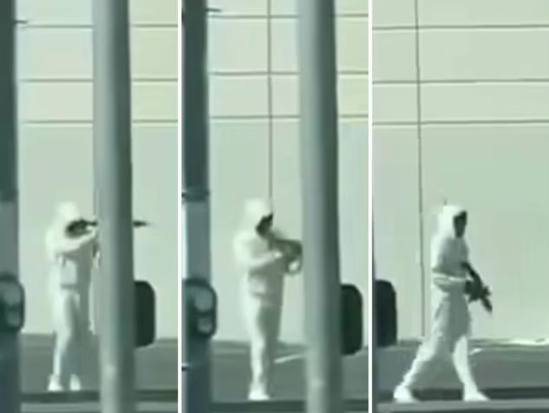 这名男子全身穿白色、戴着帽衫,把这把仿真枪举到肩膀上,摆出射击姿势,对着别人瞄准,看起来和真枪几乎一样。