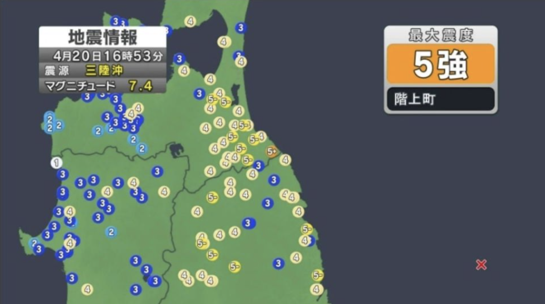 日本气象厅20日稍早前发布消息称,当天16时53分左右,该国东北部沿海地区发生7.4级地震,最大震感为震度5强,东京有明显震感。