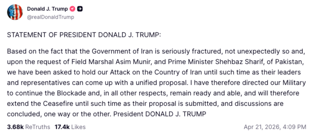“我已下令美军继续实施封锁,其余作战状态保持随时待命;同时将延长停火期限,直至伊朗提交提案,且相关讨论有了定论为止。”