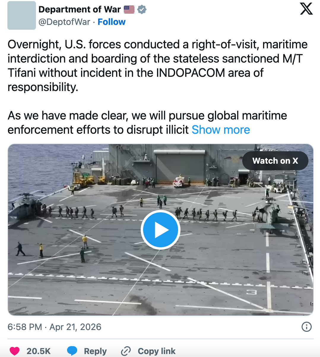 与此同时,当地时间周二早些时候,美国国防部发布一段视频,称美军在印太地区登船检查了一艘受制裁、且与伊朗有关联的油轮。美国国防部在配文中标注,“国际水域并非受制裁船只的避风港”。