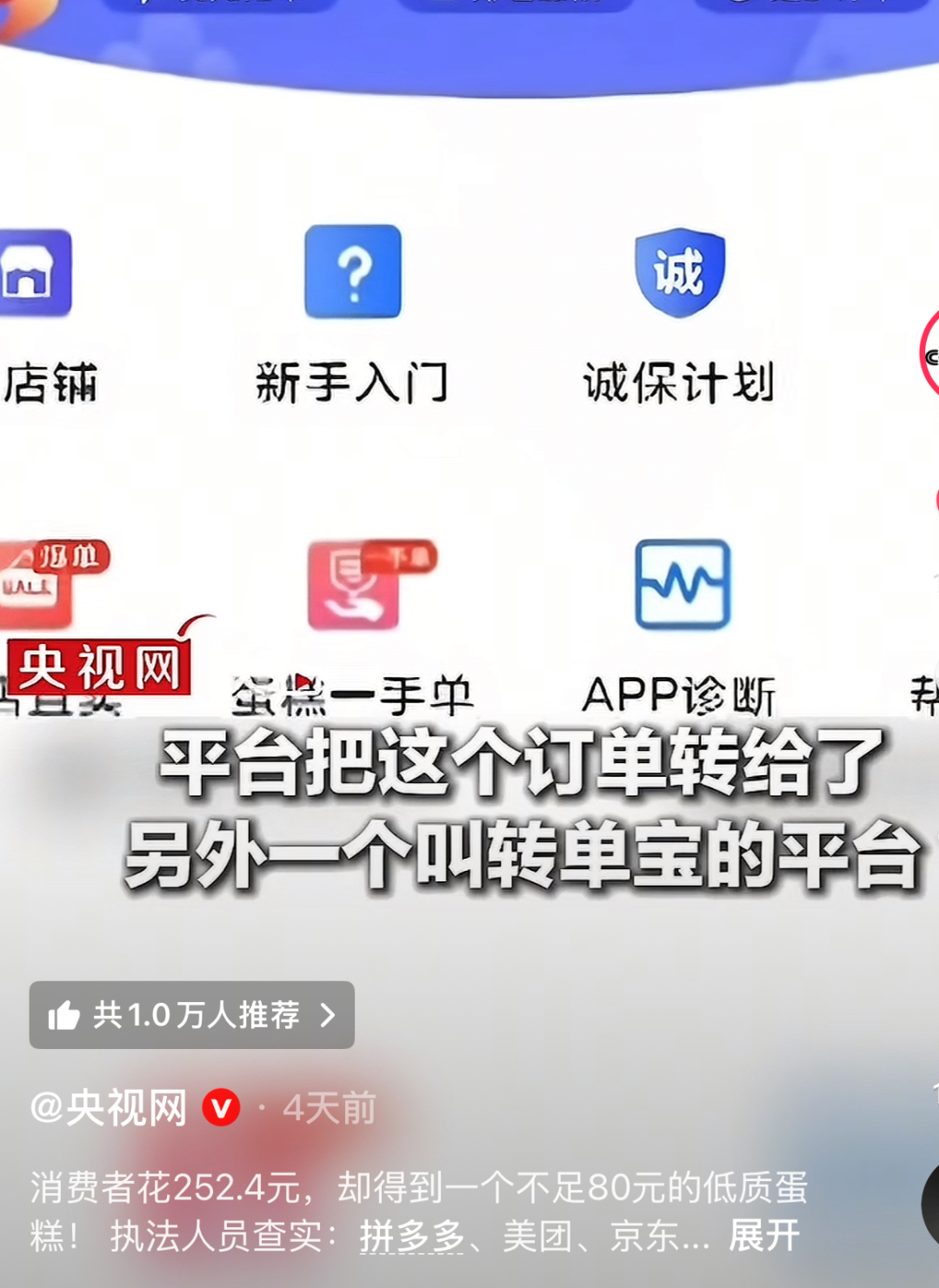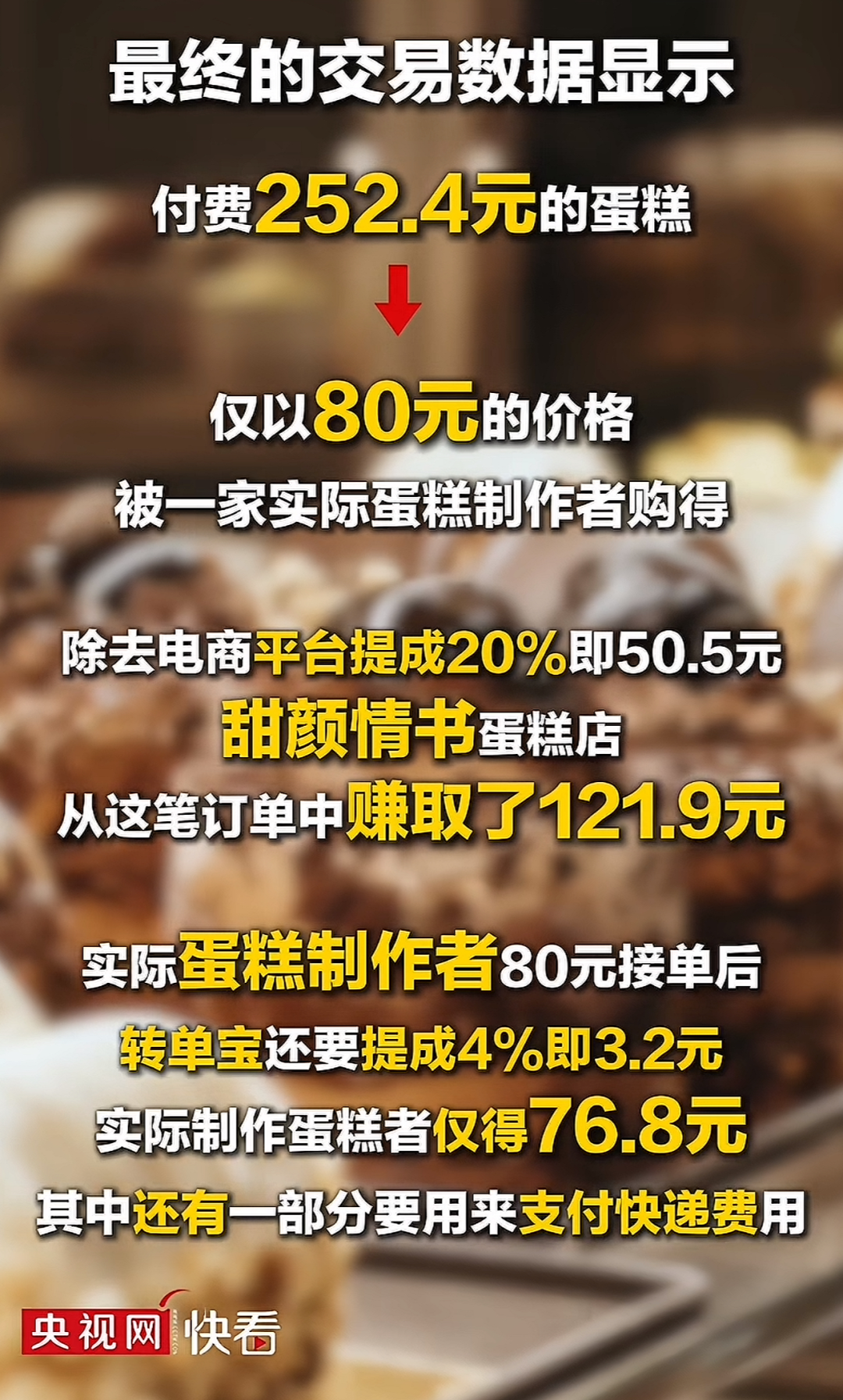 消费者花了252块钱,在平台下单买了蛋糕,接单的那家“甜颜情书”,把这个单转给其他店铺做,做完了直接送到消费者的家中。