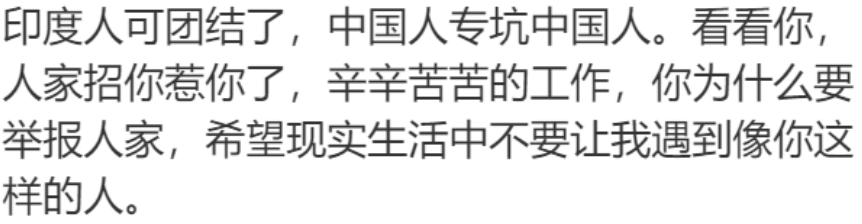 "要不说为什么华裔在外一直被欺负呢,三哥黑哥都抱团,就中国人在外面底层互害。"