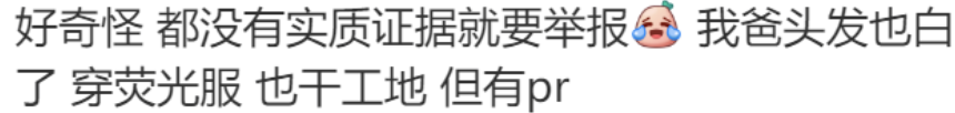 - "好奇怪 都没有实质证据就要举报 我爸头发也白了 穿荧光服 也干工地 但有pr"
