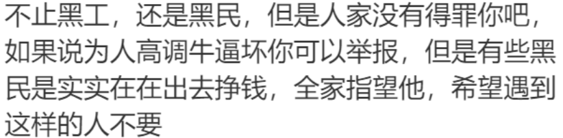 - "不止黑工,还是黑民,但是人家没有得罪你吧,如果说为人高调牛逼坏你可以举报,但是有些黑民是实实在在出去挣钱,全家指望他。"
