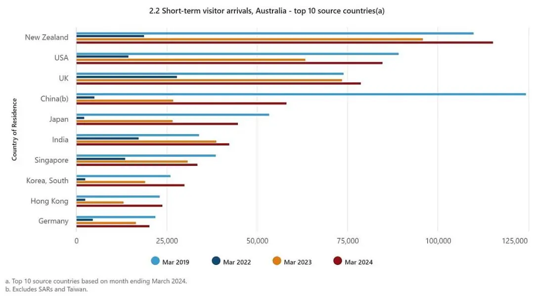 澳洲统计局上周发布的最新数据显示,今年3月,中国游客到访人数与2019年3月相比,仅为疫情前的47%。