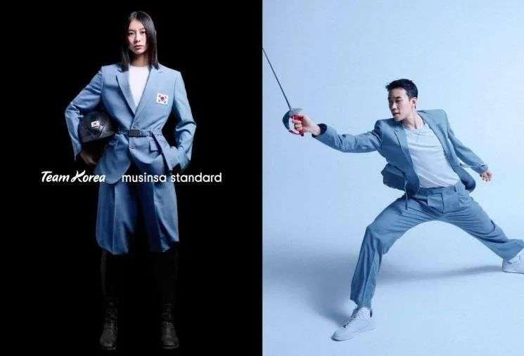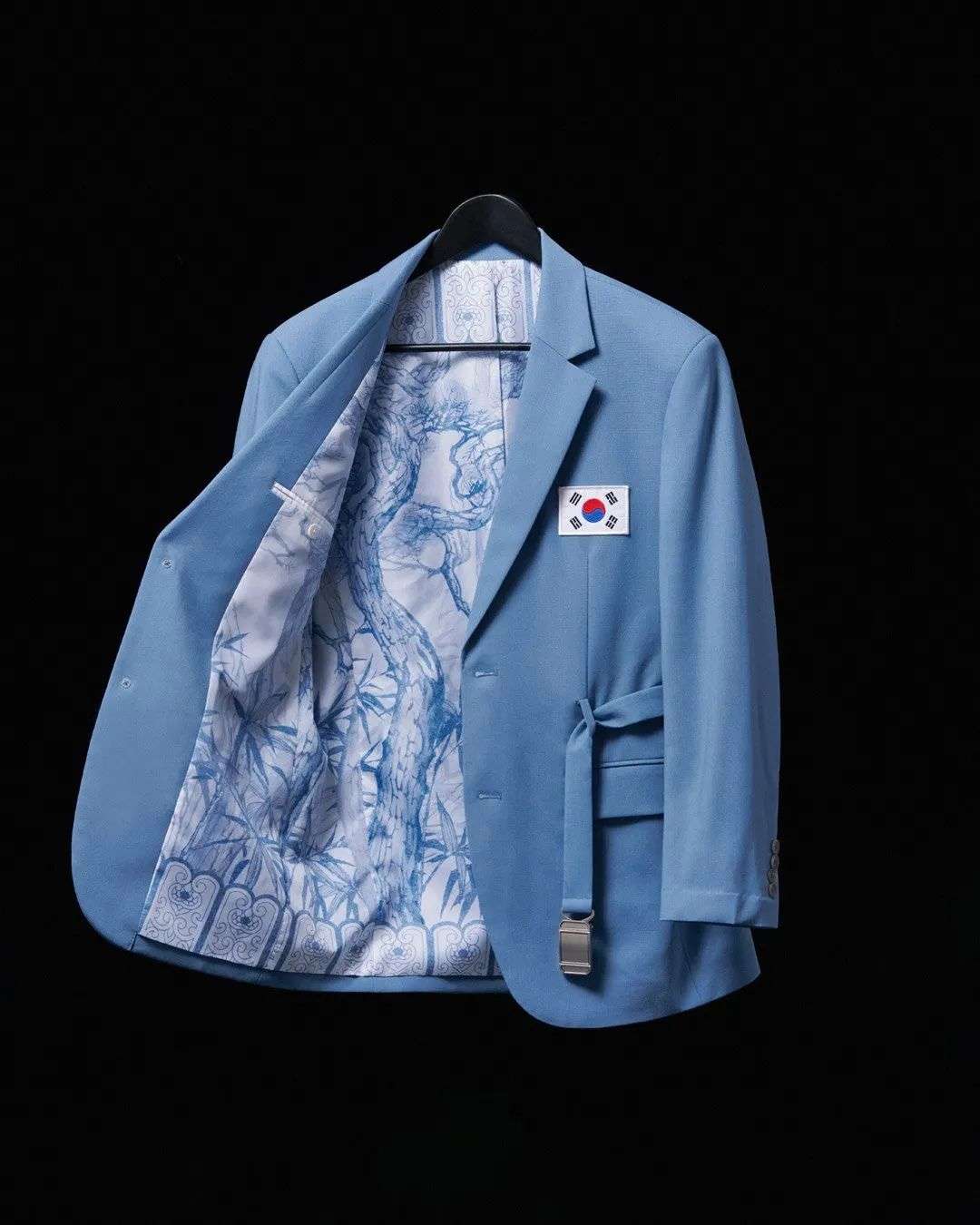 韩国代表团的开幕式和闭幕式战袍由韩国品牌Musinsa Standard设计,将粉蓝色西装改造成复古风格的青春套装。
